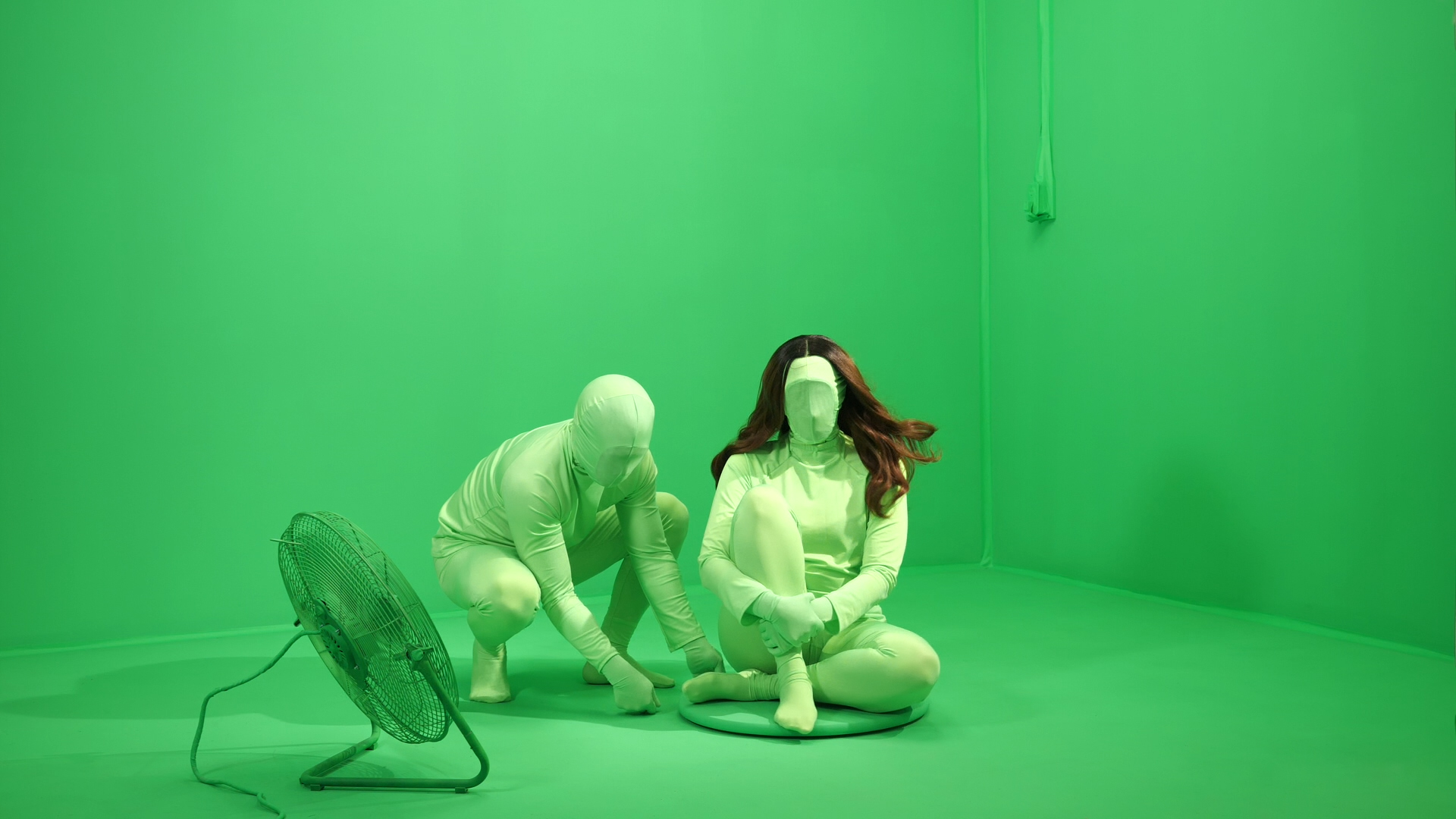 Alluding to special effects that are removed in post production, props, costume, and surroundings are chroma key green; the auburn wig stands out against its monochromatic surroundings. Although synthetic, Aria appears to have ‘natural’ roots as if the wearer’s dyed hair is growing out.