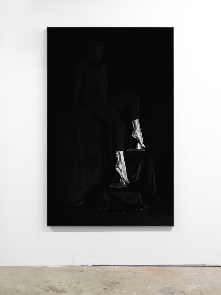 Clear Forms references an image of transparent, plastic leg forms used for sock and hosiery displays that I found online. Continuing an interest in practical special effects, I attempted to recreate the shadows, highlights, and reflections of a clear plastic surface on a black background by applying black and white makeup to a performer’s body. The contours of human feet contrast the smooth, plastic forms used in retail display. The print is nearly life-size, and holds space for the body normally absent in display props.