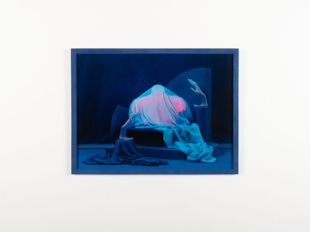 Display references materials and forms common in jewelry display; an arrangement where one can imagine jewelry items resting. In this varied edition of 9 images, the illuminated bust changes colour but its surroundings remain identical. Through careful/exacting colour management and printing process, the print aims to convey the illusion of illumination.