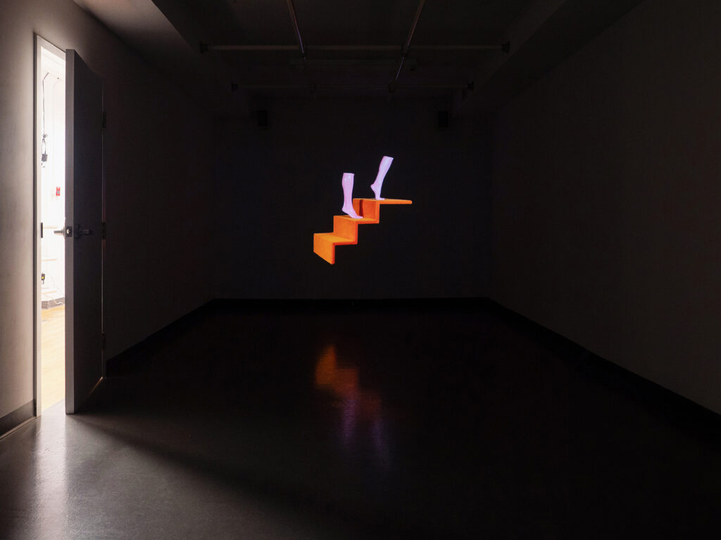 I am interested in practical special effects; how simple, tangible materials can be used to create believable, compelling illusions, even when their methods are exposed. In Display Form a performer’s legs appear disembodied. Makeup isolates them against a black background as they reenact poses from hosiery and athletic sock displays. A staircase appears to be floating in space, providing a a platform for the performance.