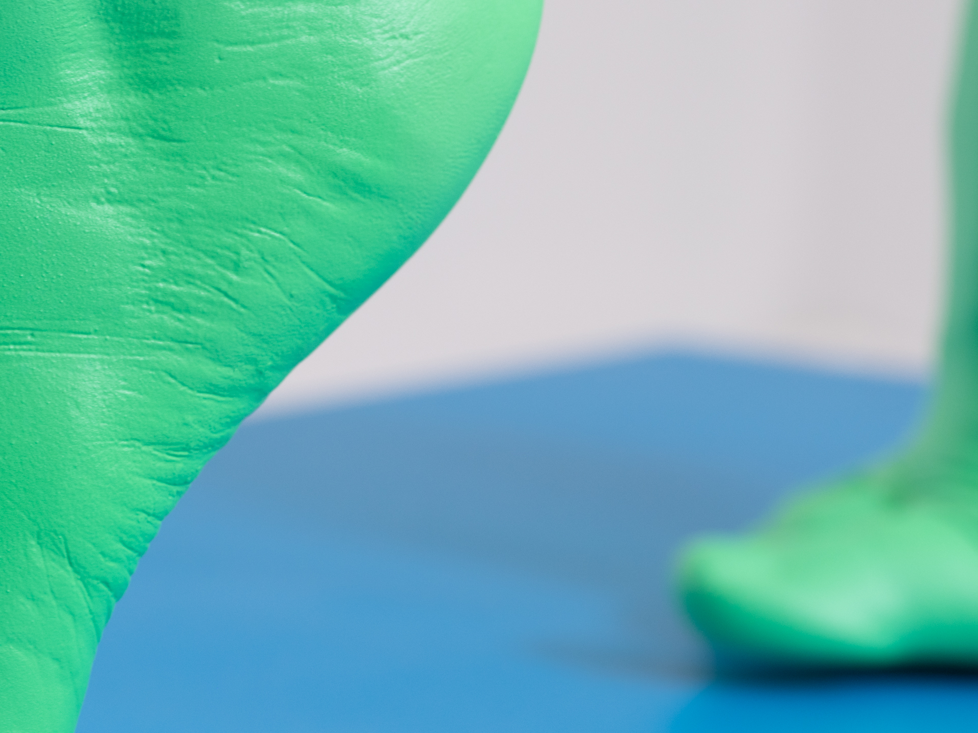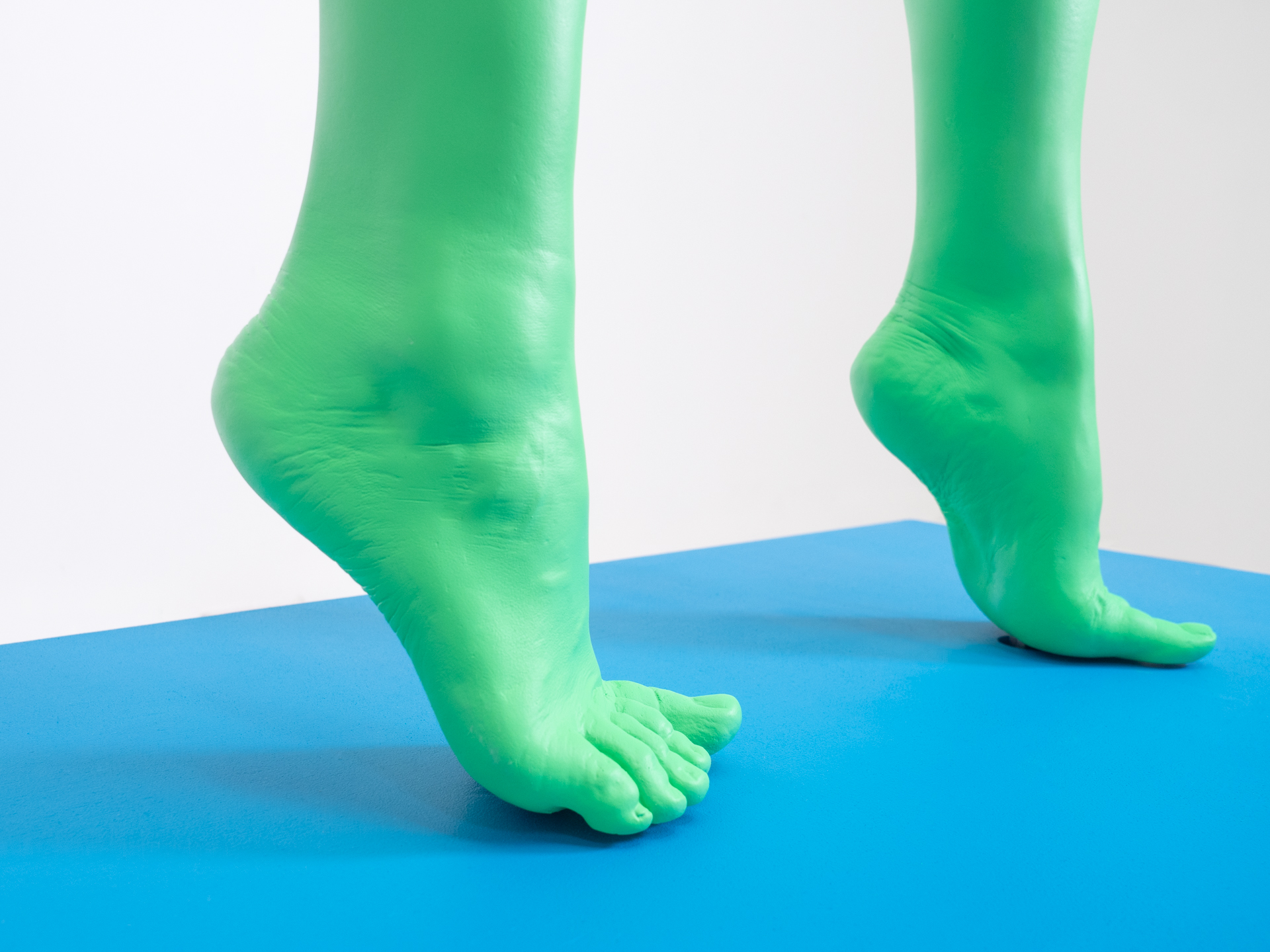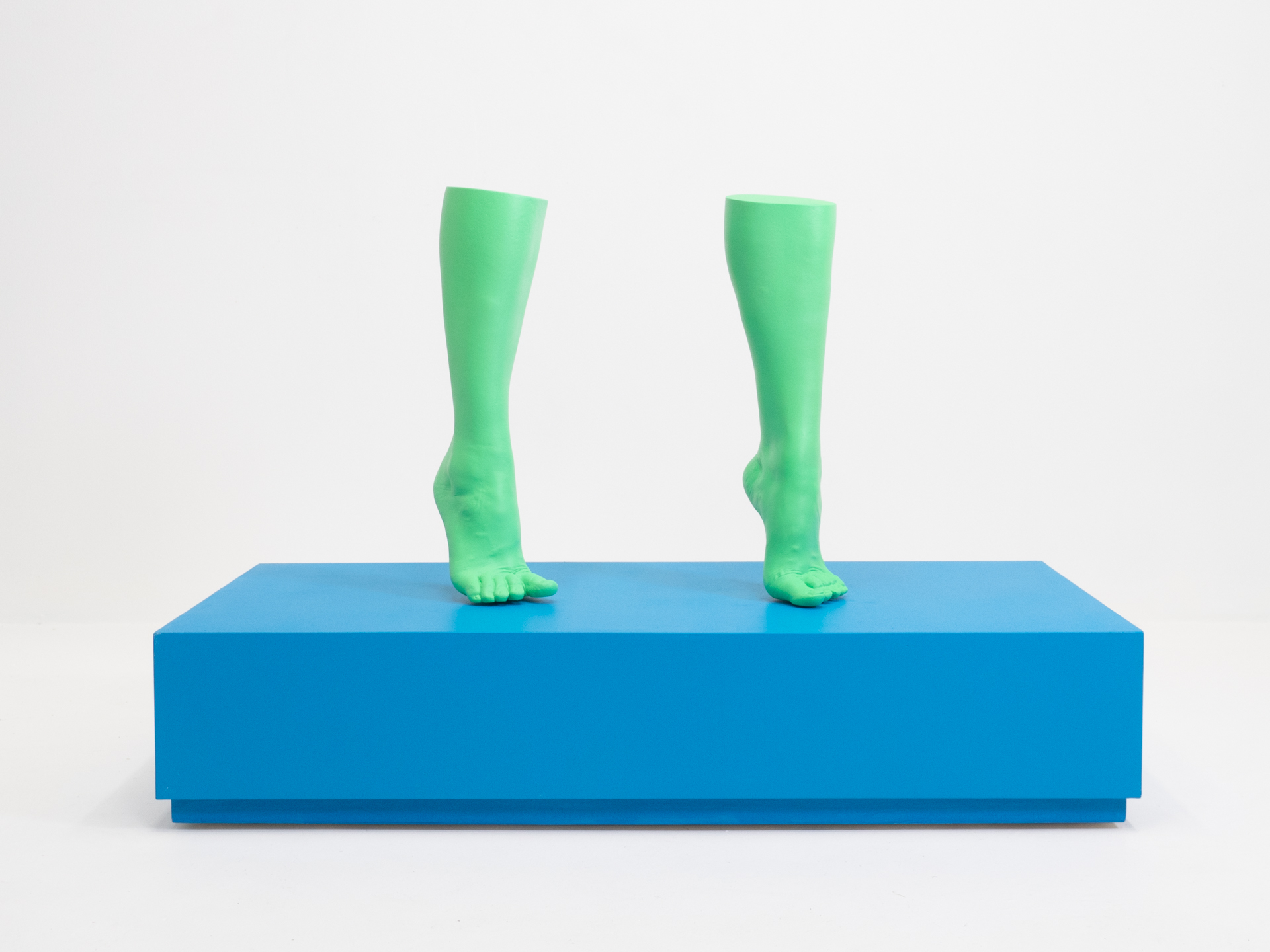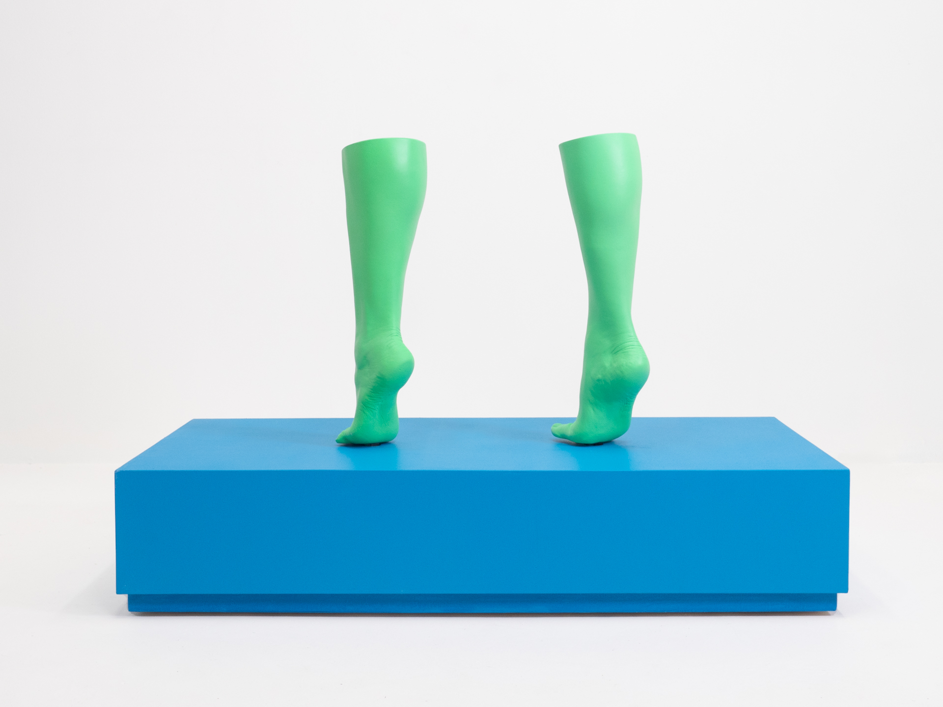Display Form, Rotating uses the same subject matter and model as Display Form. A person imitates the stance from a hosiery display, standing on the balls of their feet with raised calfs. Their activated muscles show the effort required to hold the pose, contrasting the highly stylized display forms which have no definition. The legs are cast from life and accurately render muscle tone and skin texture. Animated by a concealed motor, they turn from side to side indefinitely.