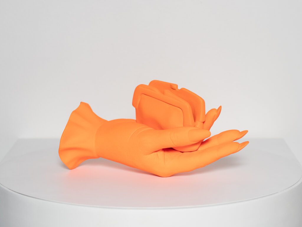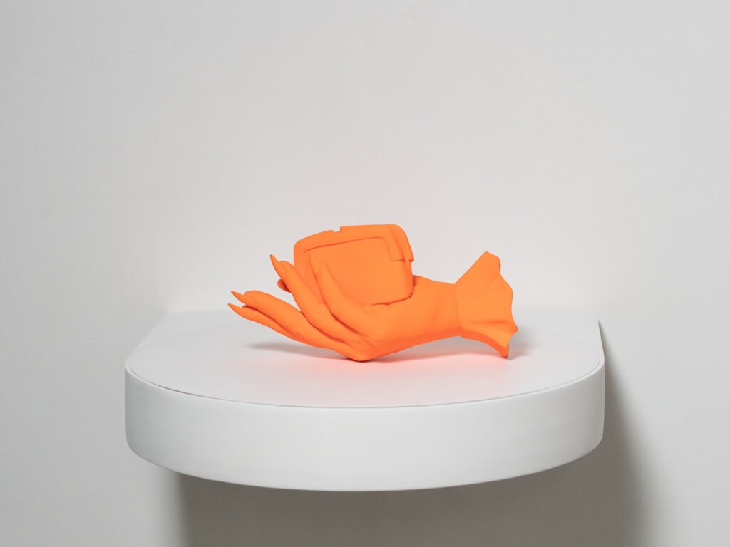 My version of this object is cast from life to retain the texture and idiosyncrasies of an individual hand. The coin purse is sculpted to fit an indent in the flesh of the palm exactly. I am interested in showing the muscles in the hand and the effort required to maintain the gesture.